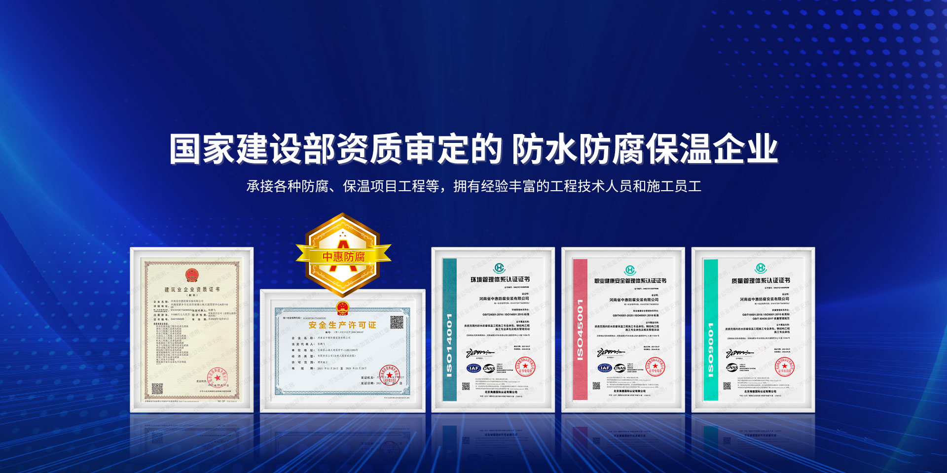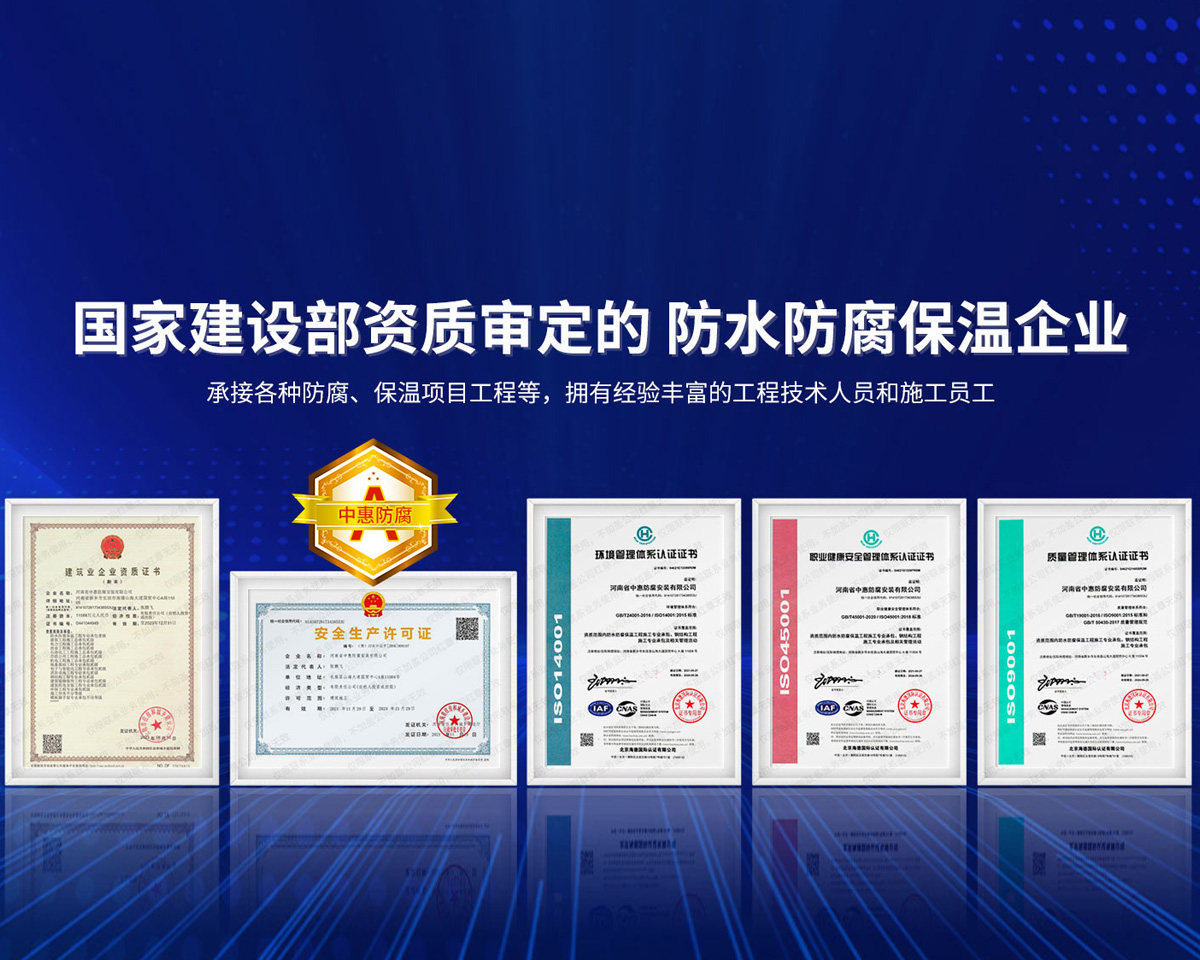 公司經營范圍:防水防腐保溫工程;消防設施工程;建筑裝修裝飾工程;建筑機電安裝工程;電力工程;建筑工程;石油化工工程;工業清洗工程;油罐清洗工程;鋼結構工程;環保工程;模板腳手架工程;電纜防火封堵、防污閃噴涂、外墻外保溫工程;各類施工勞務作業;設備維修、船舶鉚焊、涂裝;電力工程材料、建材、防水材料、防火材料、防腐保溫材料銷售,并相繼通過了GB/T19001-2008idtISO9001:2008GB/T50430-2007質量管理體系認證證書。GB/T24001-2004idtISO14001:2004環境管理體系認證證書。GB/T28001-2011idtOHSAS18001:2007職業健康安全管理體系認證證書。公司是中國防腐蝕于防護協會、中國施工企業管理協會、電力協會和中國鋼結構防水協會會員單位。 公司的經營業務涵蓋了石油、化工、電力、冶金、煤炭、船舶、國防、燃氣、水利、環保、交通運輸、航空及國防軍工和輕紡市政等行業的防腐保溫絕熱設備。鋼結構安裝、防火、防水、金屬噴鍍、聚脲噴繪、陰極保護、防滲透堵漏、玻璃鋼及各種磚版材料襯里、橡膠襯里、煙氣硫和耐酸溶劑腐蝕等工程施工。公司連續十年榮獲“省市先進施工企業”“安全生產先進單位”“重合同,守信用企業”和“AA***資質企業”的稱號。2000年被命名為市級文明單位,2002年被國家工商行政管理局命名為“重合同,守信用的企業”、被中國工業防腐蝕技術協會命名為“防腐蝕企業,能源節約及環境保護領域有豐富的經驗和***的業績。工程一次交驗合格率100%。其中攀枝花鋼鐵公司煉鐵廠四號高爐及熱風爐防腐工程、上海寶鋼公司煤氣柜防腐工程、撫順石油一廠裝置防腐項目、齊魯石化公司稀烴廠高塔防腐工程、吉林化學工業公司煉油廠油罐防腐工程、天津石化熱電廠六號爐頂棚聯絡管保溫工程、大慶油田(太倉)力神泵業工程、中國化學工程第十一建設工程、中原油田勘探局工程、中國石化銷售有限公司華北分部、魯皖輸油管道工程、貴州開磷息烽合成氨工程、陜西黃陵煤化工程、中國石油天然氣西部管道塔里木輸油工程、邯鋼集團邯寶鋼鐵公司煉鐵工程、德州供電工程、吉寶(南通)船廠工程,偃師華潤熱力工程、鄭州熱力總公司。 河南省中惠防腐安裝有限公司愿以豐富的施工經驗,***的技術,***的設備,***的管理,***的服務,竭誠為國內外廣大的用戶提供***滿意、******的工程作品。 我公司愿與國內外同仁一道,團結協作,共同推進防腐蝕行業發展! 公司地址:河南省長垣縣建設路北段360號 固定電話:0373-8866488 郵編:453400 網址:http://www_zhff_com_cn.cnahw.com